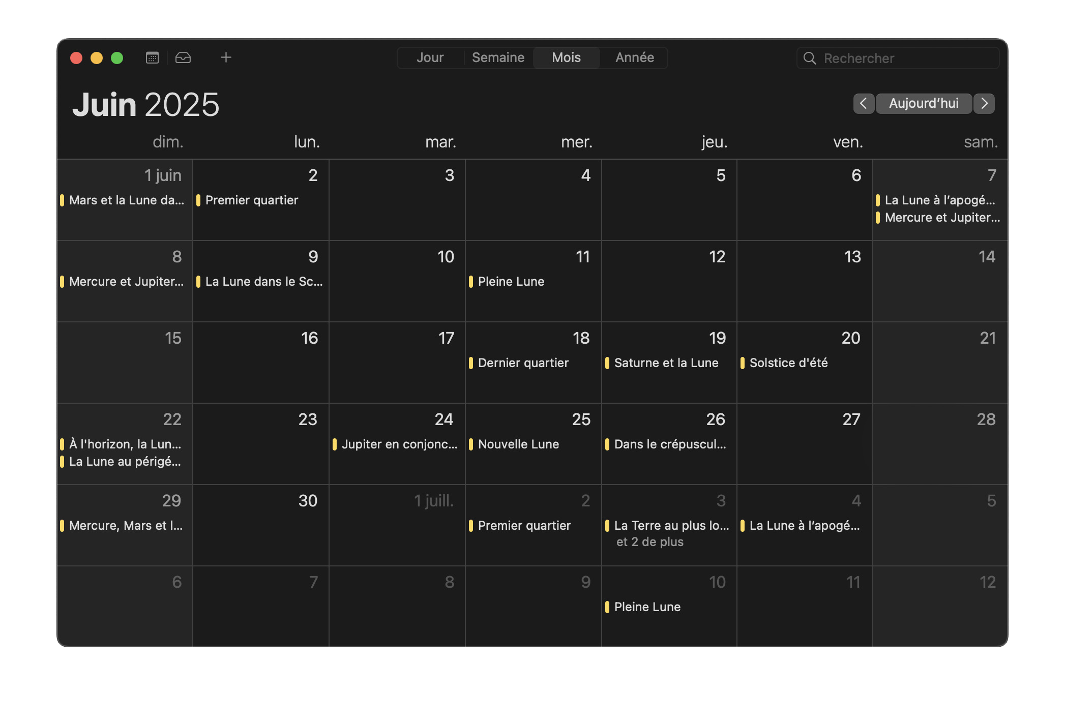 Incorporer gratuitement les éphémérides astronomiques annuelles (2025) dans votre agenda électronique sur les ordinateurs ou les mobiles. (Apple, Google, Android et Windows)